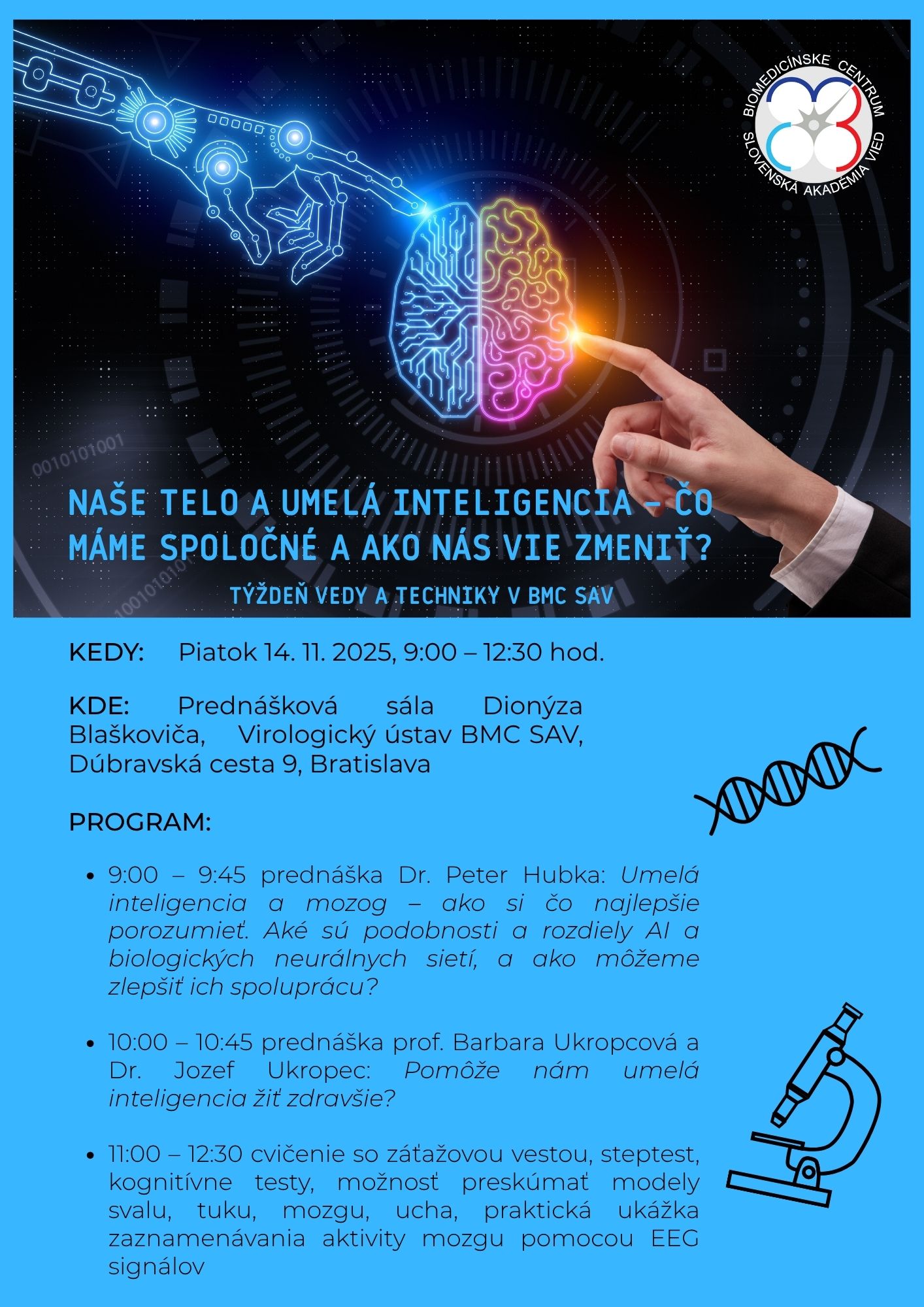 V rámci Týždňa vedy a techniky 2025 sa od 10. do 14. novembra v Biomedicínskom centre SAV, v. v. i. (BMC SAV) uskutoční rôznorodý program: čaká nás odborná prednáška Dr. Evy Budinskej (Masarykova univerzita, Brno) o odhade metabolického potenciálu, návšteva študentov Gymnázia Bilíkova na oddelení neurovied a podujatie s prednáškami a praktickými ukážkami pre gymnazistov s názvom Naše telo a umelá inteligencia – čo máme spoločné a ako nás vie zmeniť?